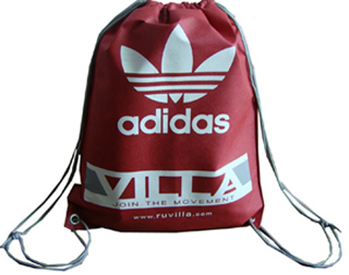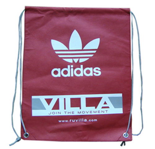 Non-woven drawstring Adidas bag with 2 steels on bottom.